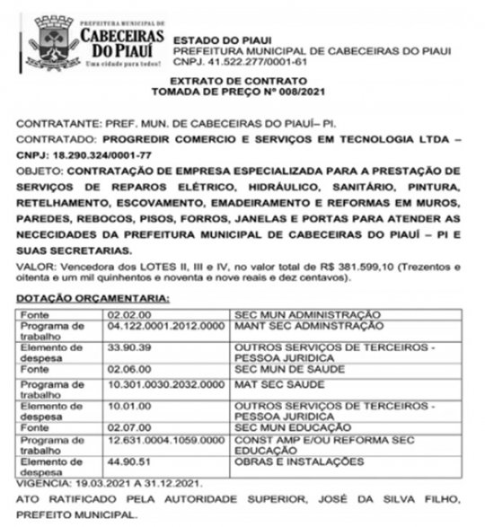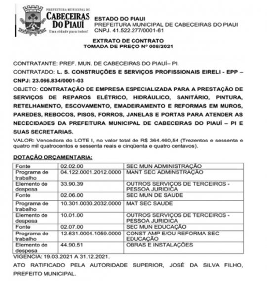 O prefeito Zé Filho, do município de Cabeceiras do Piauí (PI) contratou duas empresas no dia 19 de março num valor total de aproximadamente R$ 745 mil para prestar serviços de reparos na infraestrutura das repartições públicas do município.