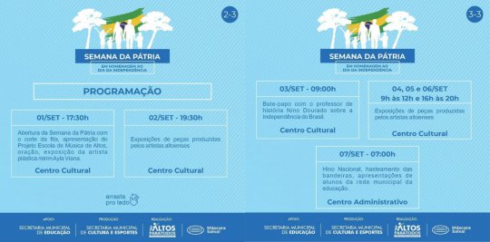 A Prefeitura Municipal de Altos (PI) através da Secretária de culta, Esporte e Lazer, realizará a partir desta quarta-feira (01) a 'Semana da Pátria' em alusão as atividades do dia 07 de setembro, dia da Independência do Brasil. O evento é aberto ao público com todo controle e prevenção contra a Covid-19.