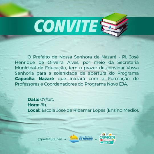 A prefeitura de Nossa Senhora de Nazaré, através do prefeito Zé Henrique, comunicou neste domingo (05), que na próxima terça-feira (07) será lançado o “Capacita Nazaré - Novo EJA”.