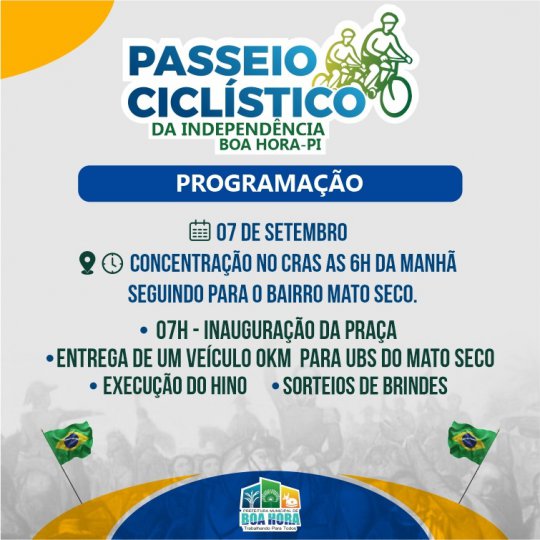 A Prefeitura de Boa Hora (PI) divulgou nesta segunda-feira (06) a programação em alusão ao dia da Independência do Brasil que será nesta terça-feira (07).