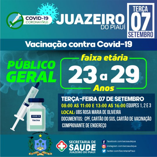A Secretaria de Saúde de Juazeiro do Piauí divulgou, através de um informe nas redes sociais, que a campanha de imunização no município vai atender as pessoas a partir de 23 anos.