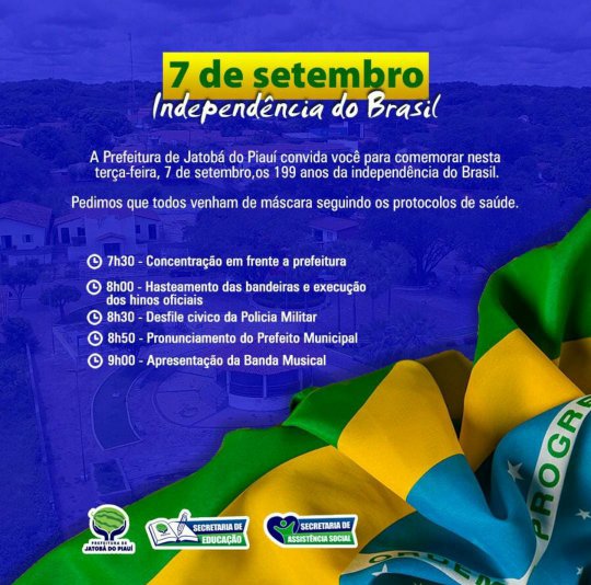 A Prefeitura de Jatobá do Piauí irá realizar a comemoração em alusão aos 199 anos da Independência do Brasil, nesta terça-feira, (07) de setembro. A programação contará com os seguintes momento: