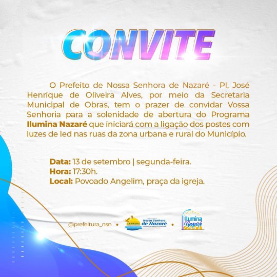 A Prefeitura Municipal de Nossa Senhora de Nazaré, através do prefeito Zé Henrique, comunica o lançamento do novo programa 'Ilumina Nazaré'.