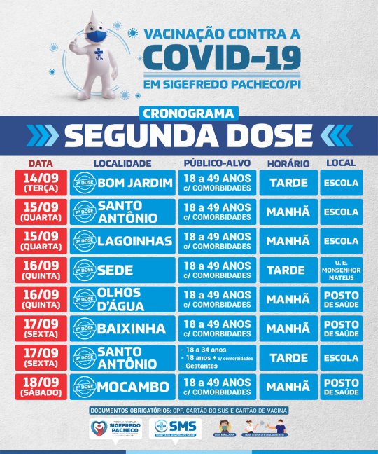 A prefeitura de Sigefredo Pacheco (PI), através da Secretaria de Saúde, dará início na tarde desta terça-feira (14) a vacinação da 2 dose contra covid-19 no município.
