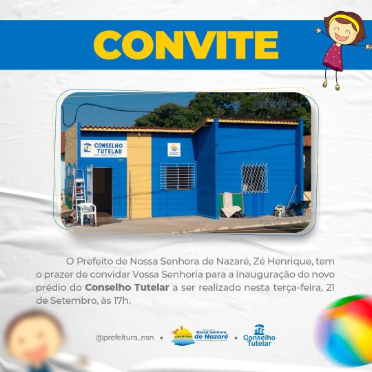 A prefeitura de Nossa Senhora de Nazaré (PI), através do prefeito Zé Henrique, convida toda a população para a inauguração do novo espaço totalmente equipado e climatizado para abrigar o Conselho Tutelar Municipal.