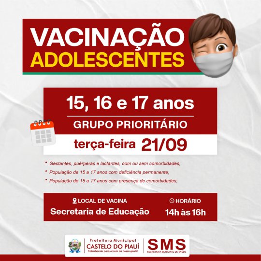 De acordo com o informe, divulgado nesta segunda-feira (20), adolescentes com deficiência permanente ou presença de comorbidades, que tenham entre 15 e 17 anos serão imunizados nesta nova etapa do plano municipal de imunizações.