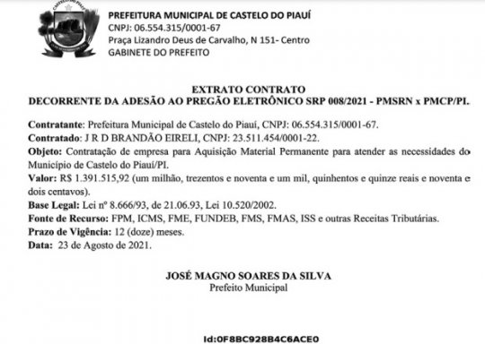 O prefeito de Castelo do Piauí, Magno Soares (PT), assinou dois contratos com as empresas Distrimóveis e Modelo Móveis no valor de R$ 1.929.016,44 (um milhão, novecentos e vinte e nove mil, dezesseis reais e quarenta e quatro centavos) para a aquisição de material permanente para atender as necessidades do município. As duas empresas são da mesma família.