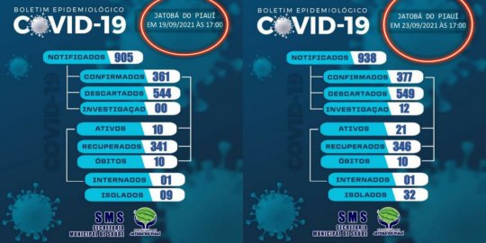 Segundo o boletim epidemiológico, há 06 dias atrás, havia apenas; 361 casos confirmados, 09 isolados, 01 internado e 10 ativos. Já o boletim emitido nesta quinta-feira (23), os números subiram rapidamente, tendo: 377 casos confirmados, 12 investigados, 21 ativos, 01 internado e 32 em isolamento.