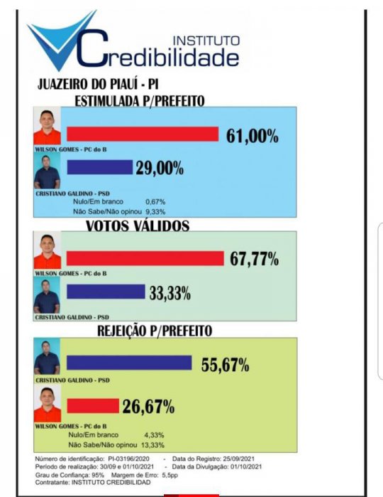 A última pesquisa que antecede a eleição suplementar de Juazeiro do Piauí, aponta para a vitória do candidato Wilson Gomes, do PCdoB, além de uma alta rejeição de seu oponente, Cristiano Galdino, do PSD.