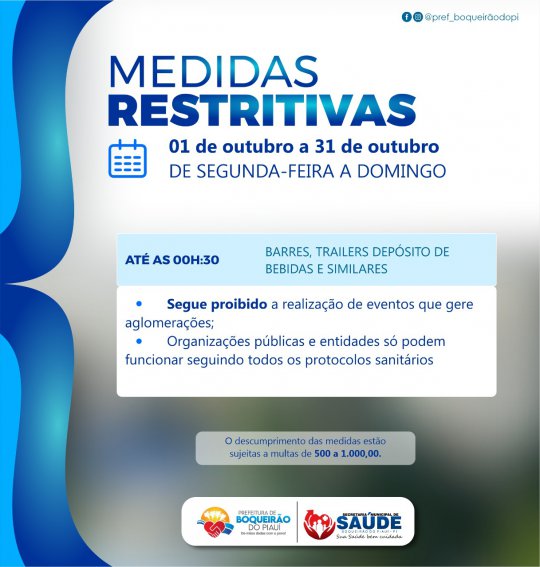 A prefeitura de Boqueirão do Piauí publicou um novo decreto que estabelece medidas sanitárias de enfrentamento à Covid-19 no município. As novas medidas restritivas estarão em vigor de 01 de outubro a 31 de outubro.