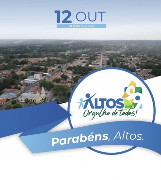 A Prefeitura de Altos também apresenta peça publicitária da programação para o dia 12 de outubro com slogan “Altos 99 anos. Orgulho de Todos!”. O prefeito Maxwell da Mariínha explica que as ações simbolizam a retomada do trabalho no município. “Queremos resgatar a autoestima do nosso povo e o orgulho de se viver em Altos e ser altoense. É possível mostrar que a gestão pública está mais próxima realizando e transformando a vida das pessoas”, disse o prefeito.
