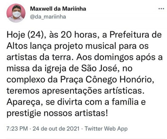 O prefeito Maxwell da Mariinha informou através de suas redes sociais, que a partir deste domingo (24), a Prefeitura de Altos dará início ao projeto musical para os artistas da terra.