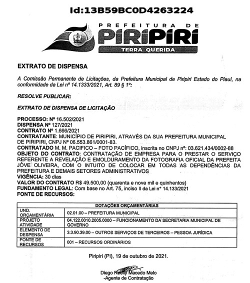 A empresa M. M. Pacifico (Foto Pacifico) foi contratada sem licitação e tem 30 dias para concluir o serviço e receber o pagamento. A fonte dos recursos é “recursos ordinários”.