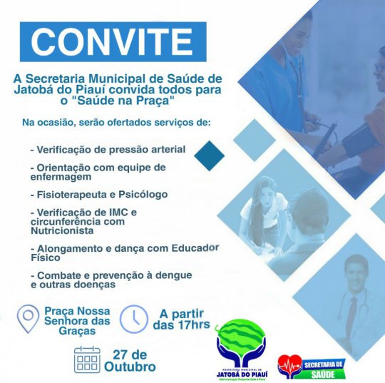 A Prefeitura de Jatobá do Piauí, através da Secretaria de Saúde vai realizar nesta quarta-feira (27) ás 17h, a 1° edição "Saúde na Praça", na Praça Nossa Senhora das Graças, no centro da cidade.