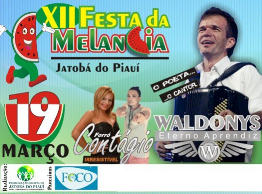 A prefeitura de Jatobá do Piauí e a Associação de Plantadores de melancia anunciaram a atração nacional Waldonys para a 12ª edição da festa da melancia. O evento foi marcada para o dia 19 de março no Galpão da Melancia, as margens da rodovia PI-320, que liga Jatobá do Piauí à BR-343 em Campo Maior.