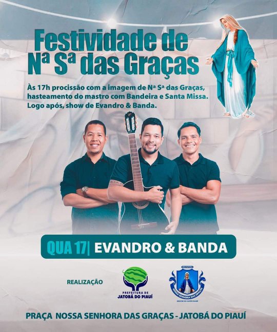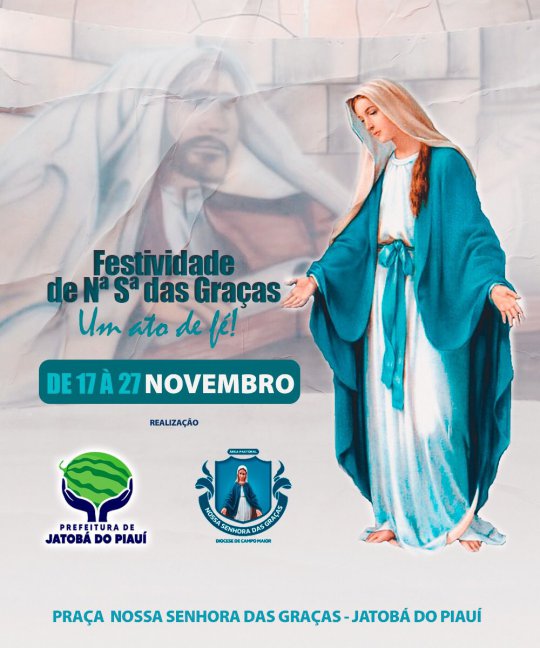 Inicia nesta quarta-feira (17) as festividades a Nossa Senhora das Graças, padroeira de Jatobá do Piauí. O evento terá inicio às 17hrs com a procissão da imagem da padroeira, logo após terá o hasteamento da bandeira e a Santa Missa.
