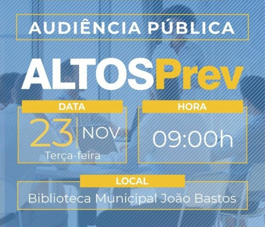 A Prefeitura de Altos convoca a toda população altoense para participar de audiência pública no dia 23 de novembro, às 9 horas da manhã, no auditório da Biblioteca Municipal João Bastos, para discutir adequação previdenciária do Fundo de Previdência Social de Altos – AltosPrev, criação de um regime de previdência complementar e estabelecer novas regras para o Regime Próprio de Previdência Social (RPPS).