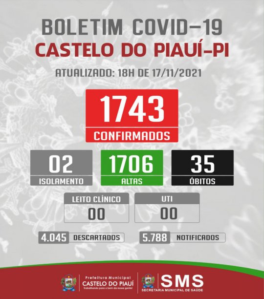 Em Castelo do Piauí, não possui nenhum paciente internado em leitos de hospitais, segundo informações do boletim epidemiológico emitido nesta quarta-feira (17). Ainda segundo o boletim, apenas duas pessoas estão ativas para o vírus. Desde o início da pandemia, o município registrou 1743 casos, 706 altas médicas e 35 óbitos.