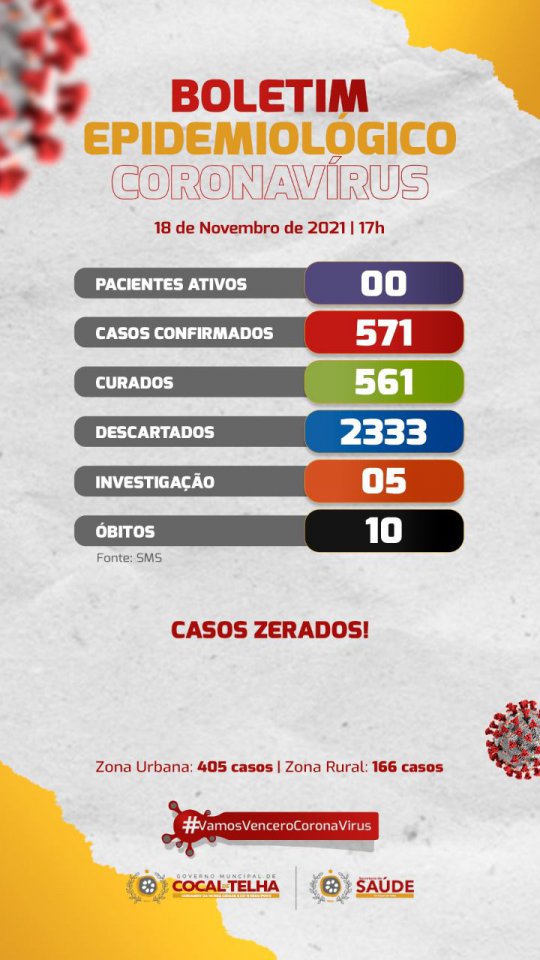 Ainda segundo o boletim, apenas cinco pessoas estão em investigação para o vírus. Desde o início da pandemia, o município registrou 571 casos, 561 curados e 10 óbitos.