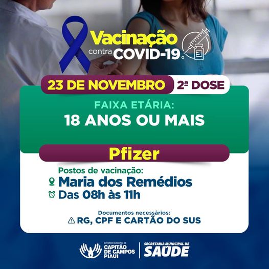 A Secretaria de Saude de Capitão de Campos (PI) informou neste sábado (20), que a partir do dia 23 de novembro estará disponível a 2° dose da vacinação para a faixa etária de 18 anos ou mais.