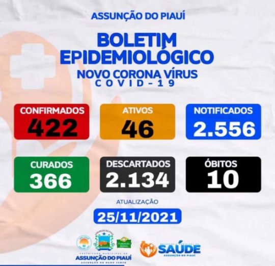 A Prefeitura de Assunção do Piauí emitiu um boletim epidemiológico na noite desta quinta-feira (25), informando que o município possui 422 casos confirmados, 46 ativos, 2556 casos notificados, 366 curados e 10 mortes.