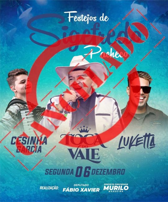 Em Sigefredo Pacheco está acontecendo os festejos da Padroeira Nossa Senhora da Conceição, por ocasião da festa religiosa, estava previsto acontecer um mega evento no dia 06 de dezembro com o cantor Toca do Vale e outras atrações na mesma data como também em outras noites do festejo. O evento era uma parceria do prefeito Murilo Bandeira e do deputado estadual Fábio Xavier presenteado a cidade por ocasião do festejo, o prefeito relatou que: “a decisão de cancelar o evento foi em comum acordo com o deputado seguindo orientação do decreto do governo do estado, não faltaram oportunidades para realizarmos outro evento em outra data, o momento é de respeitar as decisões e orientações da autoridades de saúde e principalmente respeitar a vida da nossa população vamos fazer a nossa parte”, disse o prefeito.