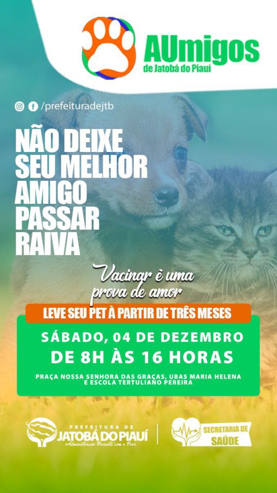 A Prefeitura Municipal de Jatobá do Piauí, através da Secretaria Municipal de Saúde, informa que neste sábado (04) inicia a vacinação contra a raiva para gatos e cachorros que tenham a partir de 3 meses de idade.