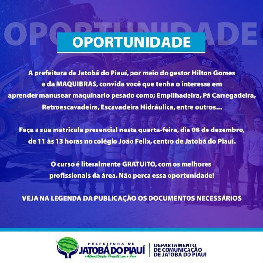 A prefeitura de Jatobá do Piauí, através do prefeito Hilton Gomes e da MAQUIBRAS, convida a todos que tenham interesse em aprender manusear maquinário pesado como; Empilhadeira, Pa Carregadeira, Retroescavadeira, Escavadeira Hidráulica, entre outros.