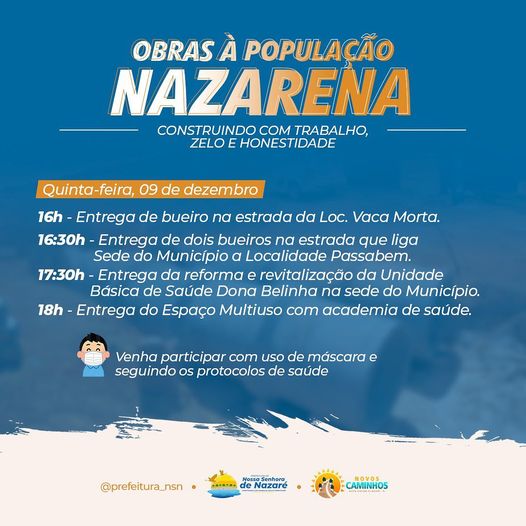 O prefeito Zé Henrique, vice-prefeito, secretários e vereadores, convida toda a população para acompanhar a inauguração de várias obras no município. O evento acontecerá a partir das 16h desta quinta-feira, 09 de dezembro, percorrendo vários pontos por Nossa Senhora de Nazaré, entregando a população mais desenvolvimento e compromisso.