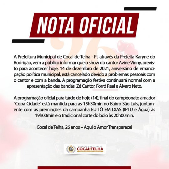 Após a confirmação que o cantor Ávine Vinny havia sido solto pela Justiça, após passar a noite preso na delegacia por ser acusado de agredir verbalmente e ameaçar a esposa de morte, a Prefeitura Municipal de Cocal de Telha informou através de uma nota que o show do cantor que seria em comemoração aos 26 anos de emancipação política do município, está CANCELADO!