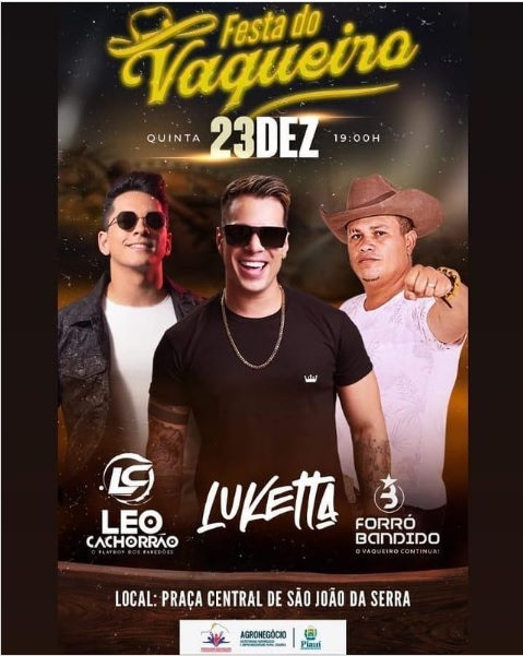 A Prefeitura de São João da Serra (PI) realizará nesta quinta-feira (23) a tradicional festa do vaqueiro a partir das 19hras com os shows de LUKETTA, LEO CACHORRÃO, E FORROR BANDIDO. O evento será aberto ao público na praça central da cidade.
