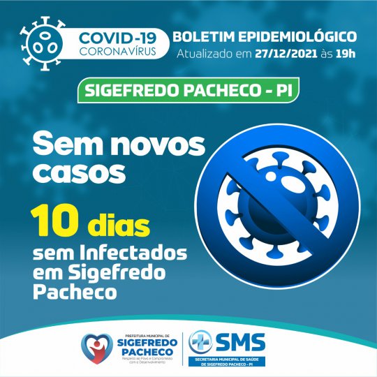 A secretaria municipal de saúde de Sigefredo Pacheco divulgou Boletim Epidemiológico Covid-19 de Sigefredo Pacheco, Piauí no inicio da noite de hoje (27/12/2021, 19:00h) com ZERO casos da COVID -19.