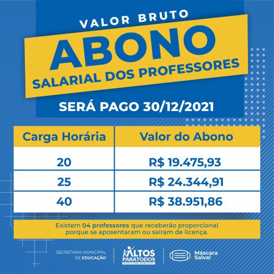 “Professores e professoras, encontro-me muito feliz por encerrar este ano podendo cumprir o pagamento integral do valor bruto do abono salarial a vocês, que tanto fazem por nossa educação. Sei que se trata de uma obrigação como gestor, mas o faço com sentimento de dever cumprido em honrar um direito a que fazem jus deste benefício tão necessário. Serão quase 300 professores beneficiados com esse pagamento que vem de encontro à valorização de vocês. O pagamento acontece na quinta-feira, dia 30 de dezembro, com valores que variam de 19 mil e 400 reais até quase 39 mil reais. Com responsabilidade e equilíbrio, temos conseguido colocar altos no caminho do desenvolvimento. Altos é mais educação. Altos é para todos”, disse o gestor.