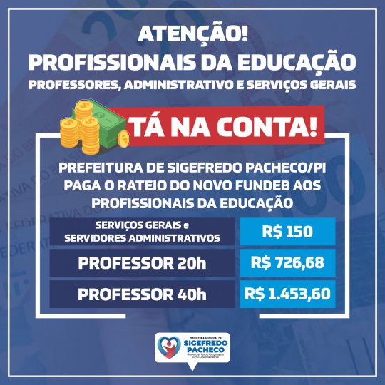 A gestão do prefeito Murilo Bandeira, realizou nesta sexta-feira (07) o pagamento do valor do rateio para os profissionais da educação básica do município, além dos Serviços Gerais, Vigias e Administrativos.