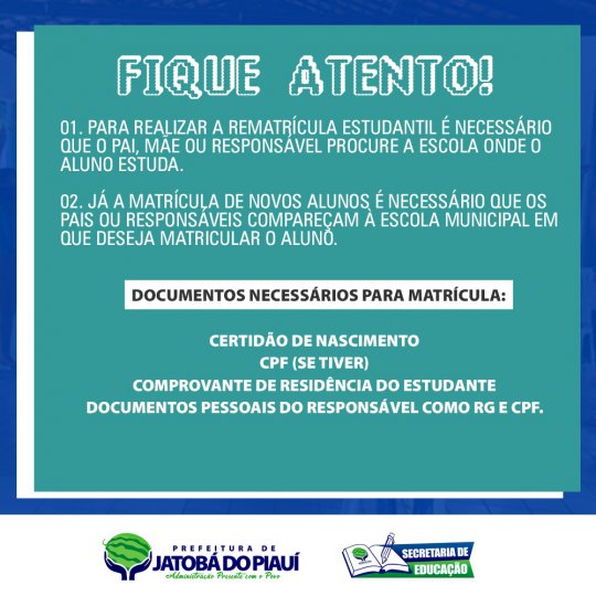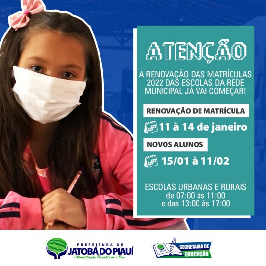 A Secretaria de Educação de Jatobá do Piauí informa que a renovação das matrículas do ano letivo de 2022 das escolas municipais urbanas e rurais iniciam nesta terça-feira (11) e vai até sexta-feira dia (14). Para os novos alunos que iniciaram o período letivo pela primeira vez, a matrícula inicia nesta sábado (15) e vai até o dia 11 de fevereiro.