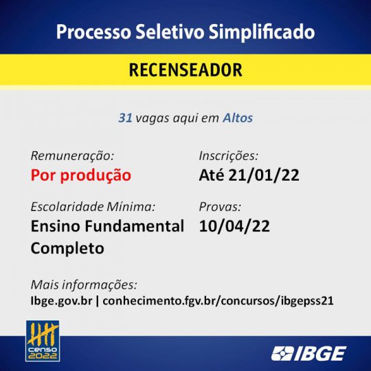Ao todo serão 31 vagas para recenseadores, 1 vaga para agente censitário municipal e 4 vagas para agente censitário supervisor. O trabalho por produção setorial do recenseador pode chegar a mais de R$ 2 mil por mês. Os trabalhos de coleta durarão de 3 a 5 meses. As provas ocorrerão no dia 10 de abril.
