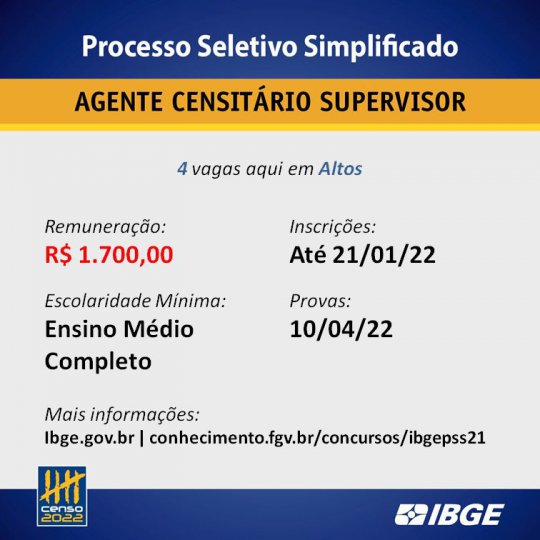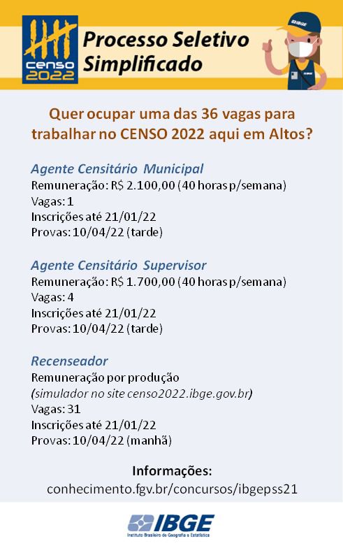 Prefeitura de Altos (PI) em parceria com IBGE abre processo seletivo para recenseadores