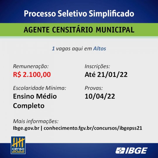 Na ocasião foi discutido sobre o recenseamento da população altoense que ocorrreu pela última vez há mais de uma década. Tendo em vista essa dependência, o IBGE abre, agora, processo seletivo com inscrições até às 16 horas de 21 de janeiro para preenchimento de vagas de recenseadores com salários que vão de R$ 1.700,00 a R$ 2.100,00.