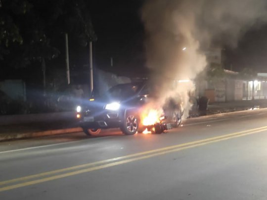 Câmeras de segurança flagraram o momento em que o carro passava com a moto em chamas. O local está interditado devido os riscos de explosão. O Corpo de Bombeiros foram acionados.