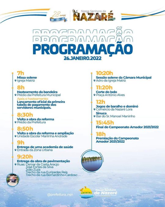 A prefeitura de Nossa Senhora de Nazaré, através do prefeito Zé Henrique, anunciou nesta sexta-feira (21) o lançamento oficial da programação do aniversário de 28 anos de emancipação política municipal, celebrada na próxima quarta-feira, 26 de janeiro de 2022.
