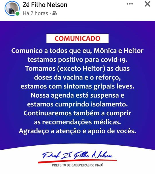O prefeito de Cabeceiras do Piauí, José Filho, informou através de uma nota nesta quinta-feira (27) que ele, a esposa Mônica e o filho, testaram positivo para Covid-19.