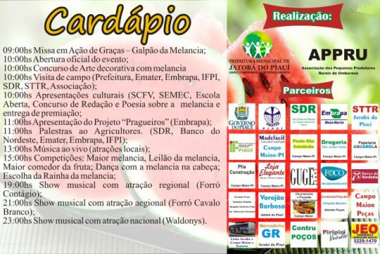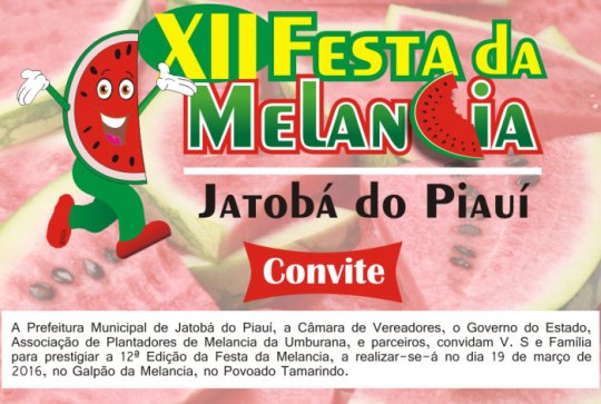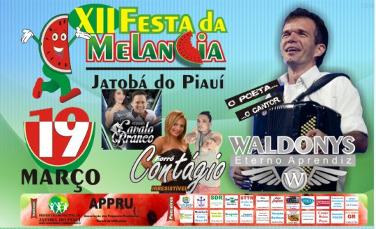 Uma das maiores festas da Região dos Carnaubais, marcada para o dia 19 de março, já tem a programação oficial definida. Segundo a assessoria de imprensa da prefeitura de Jatobá do Piauí, a programação da 12ª festa da melancia é variada e procura agradar a todos os públicos.