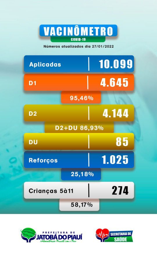 Nesta quinta-feira (27) o município de Jatobá do Piauí atingiu a marca de 10 mil doses aplicadas da vacina contra a covid-19. O vacinômetro do município mostra 4.645 vacinas de primeira dose aplicadas, o que representa mais de 15% da população que já está ao menos, parcialmente, protegida contra as formas mais graves da doença. O total de vacinas aplicadas soma 15.099 doses.