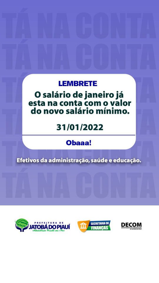 A prefeitura de Jatobá do Piauí, por meio da Secretaria de Finanças realizou nesta segunda-feira (31) o pagamento dos salários dos servidores efetivos da administração, saúde e educação.
