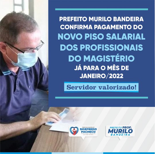 O prefeito de Sigefredo Pacheco PI professor Murilo Bandeira confirmou na manhã de hoje (31) que o municipio vai pagar o novo piso do magistério com alta de 33,24%. O prefeito já autorizou a secretária Elisangela Gomes e o setor de finanças para fazer as alteração na folha de pagamento referente a janeiro de 2022, de acordo com a gestão, o pagamento com o novo piso estará disponivel nas contas dos servidores