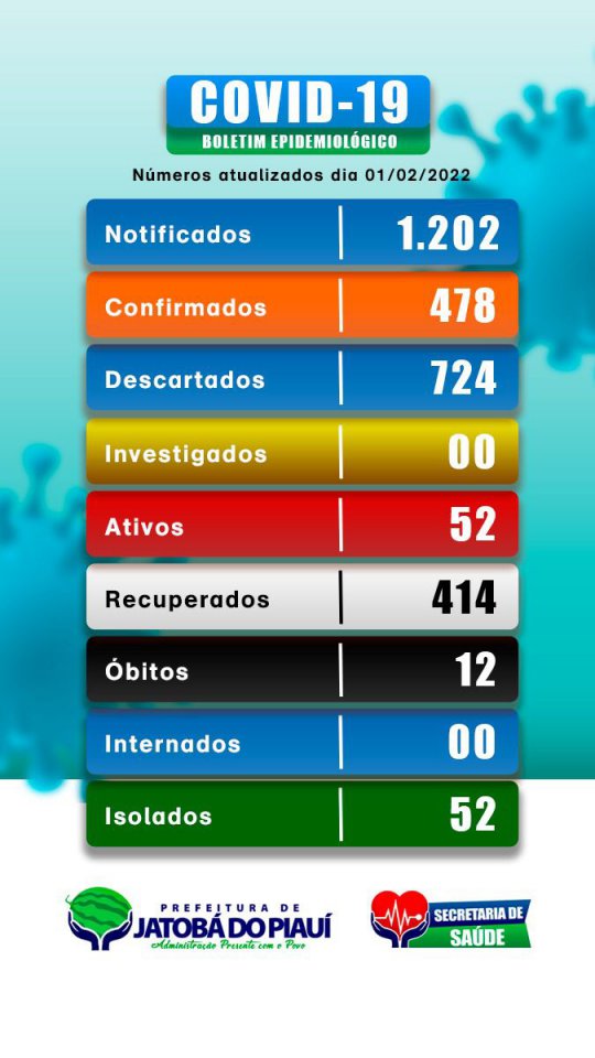 O boletim epidemiológico divulgado nesta terça-feira (01), informa que a Secretaria de Saúde, registrou 52 casos de Covid-19, sendo 36 pessoas no centro da cidade, um na comunidade Sambaíba, um na comunidade Atoleiro, um na comunidade Baixão dos Tucuns, 3 na comunidade Bananeira, um nos Tinquis e um na comunidade Cajueiro, um na comunidade lagoinha, um na comunidade Tamarindo, um na comunidade Riacho, um na comunidade Tucuns, 4 na comunidade Sertãozinho.