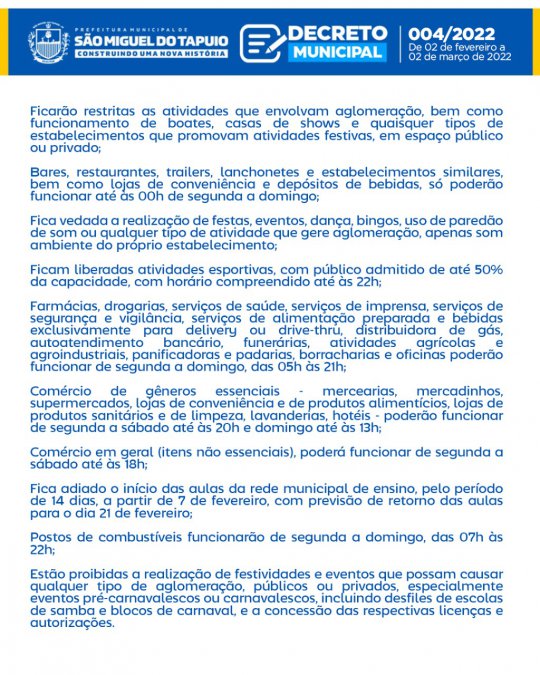 A Prefeitura de São Miguel do Tapuio (PI) segue desde quarta-feira (02), medidas restritivas decretadas pelo Governo do Estado em combate à Covid-19, conforme normas estabelecidas no decreto Nº 004/2022, no âmbito do município válido até o dia 02 de março.