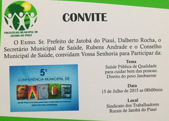 A prefeitura de Jatobá do Piauí, através da secretária de saúde, realiza a 5ª Conferência Municipal na próxima quarta-feira, dia 15, no auditório do Sindicato dos Trabalhadores e Trabalhadoras Rurais. A programação começa as 08:00hs.