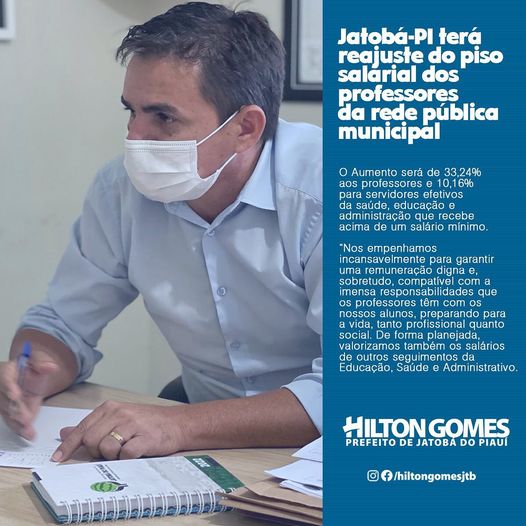 Nesta segunda-feira (14) o prefeito de Jatobá do Piauí, Hilton Gomes anunciou o reajuste do piso salarial em 33,24% aos professores e 10,16% aos servidores efetivos da saúde, educação e administração que recebe acima de um salário mínimo.