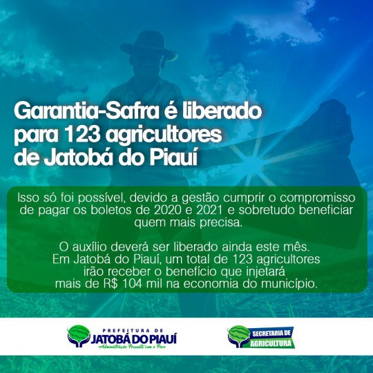 A Prefeitura de Jatobá do Piauí, por meio da Secretaria Municipal da Agricultura, informa aos agricultores que fizeram adesão e os pagamentos do Garantia-Safra, que auxilio aos agricultores já está disponível.
